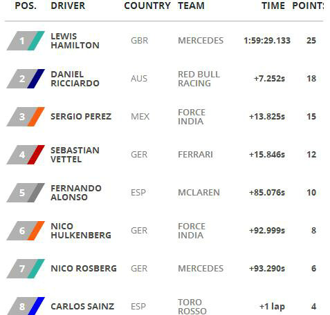 印度力量车队佩雷兹因为成功的进站战术最后竟然排在维泰尔前面夺得季军,这是这支车队成立以来的最好成绩,恭喜他们。法拉利车队本站没有太多亮点,在莱科宁因为自己驾驶失误退赛之后,维泰尔没有尝试激烈的驾驶,最终夺得第四并令车队继续占据积分第二位置。莱科宁本赛季的表现和多次失误令大家失望,本赛季应该是他在法拉利的最后一站。
